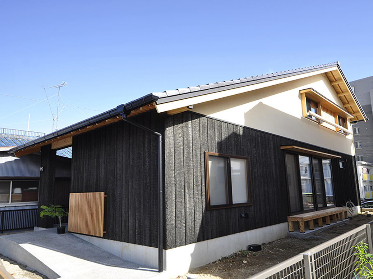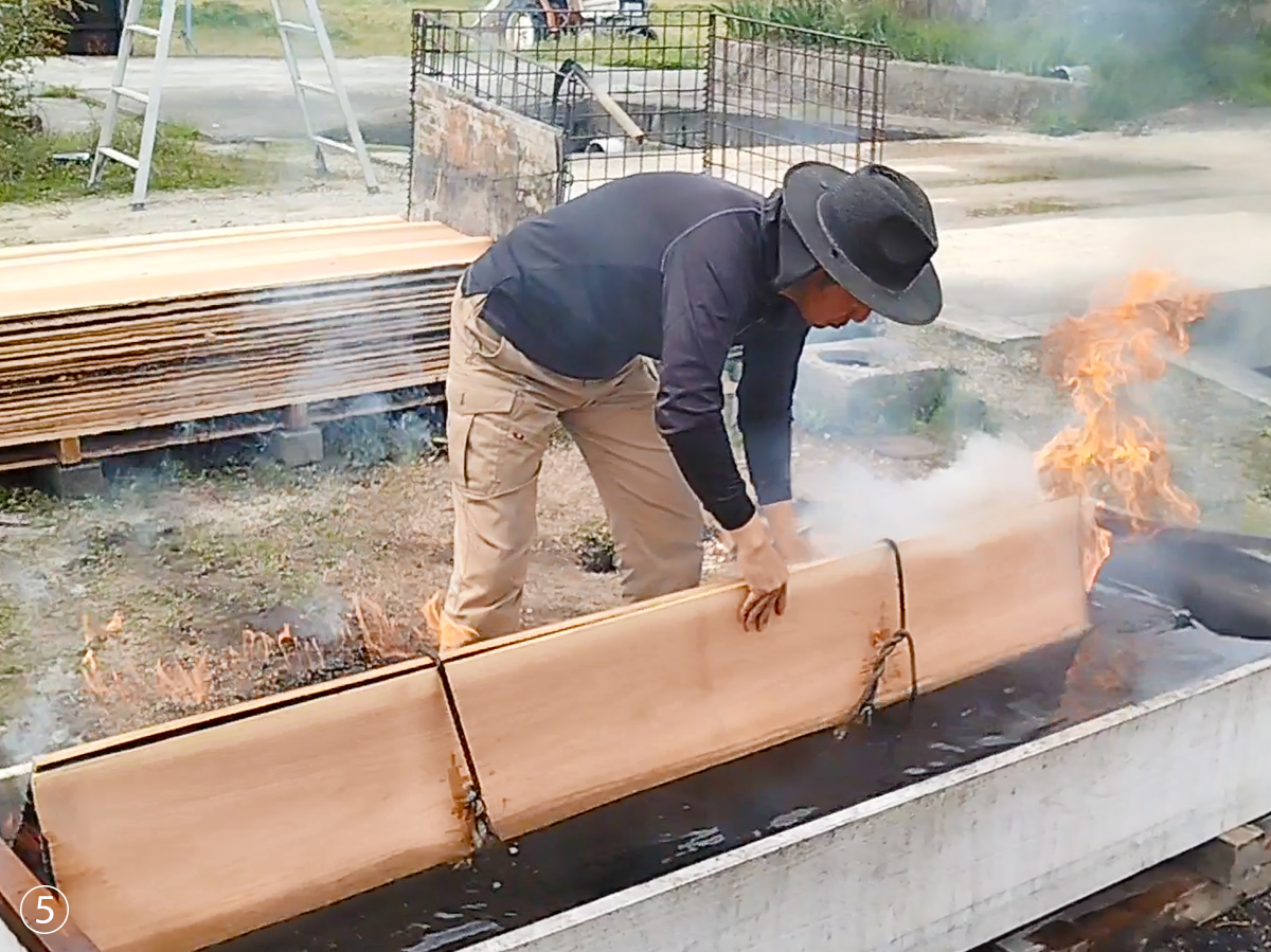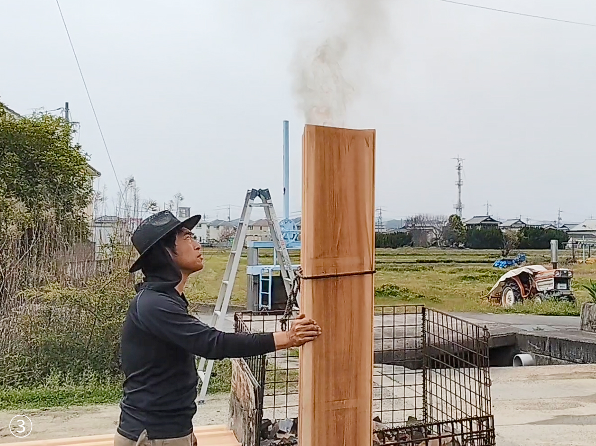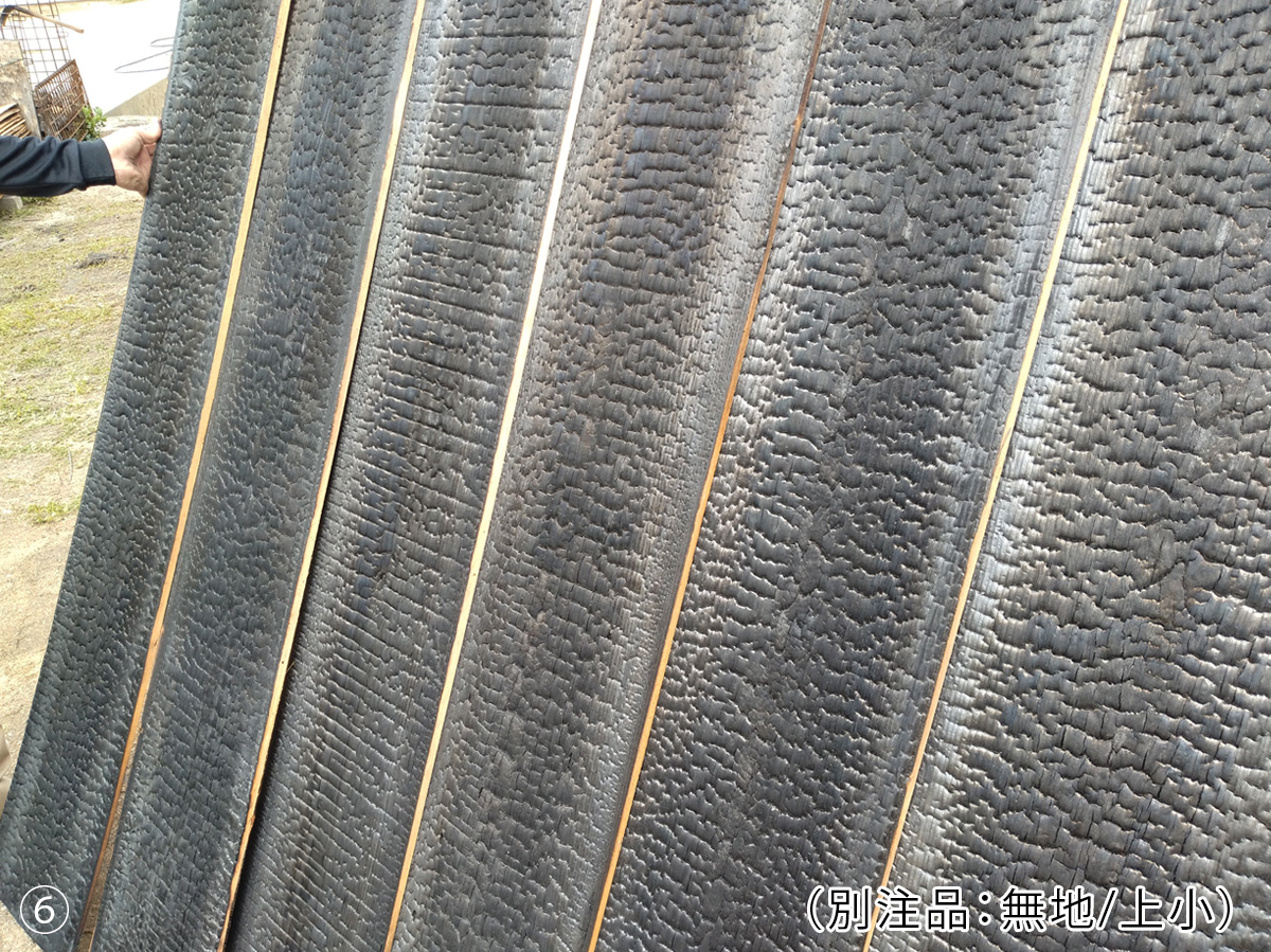 「本焼板」は、機械焼きと比べて炭化層が厚いことが特徴であり、その炭化層が厚くなることで、 耐久性の向上、防虫防蟻、断熱性向上の効果が期待されます。