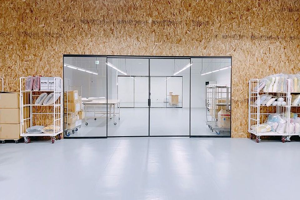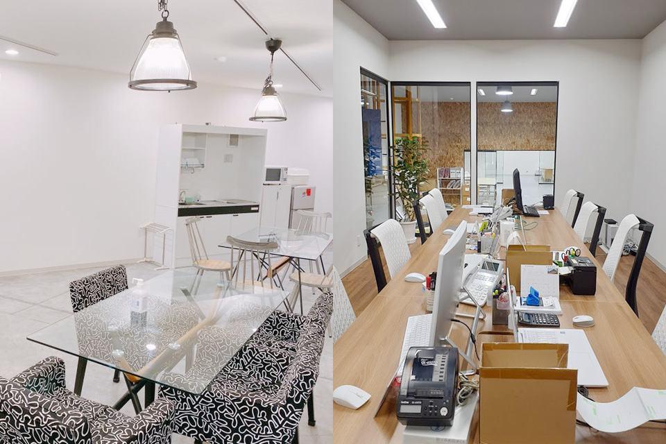 ジスクリエーションさんは、名古屋市に本社をおくリビング用品の企画・デザイン・製造および販売をされている会社です。メインエントランスでは、レッドシダーの横貼り、ラウンジ外壁には、OSB合板を使っています。オシャレで清潔感あふれる場内で、作業される従業員さんの仕事に対するモチベーションもUPです。一番の見所は、大開口のガラス引戸で、場内奥まで一気に見渡せるところです。