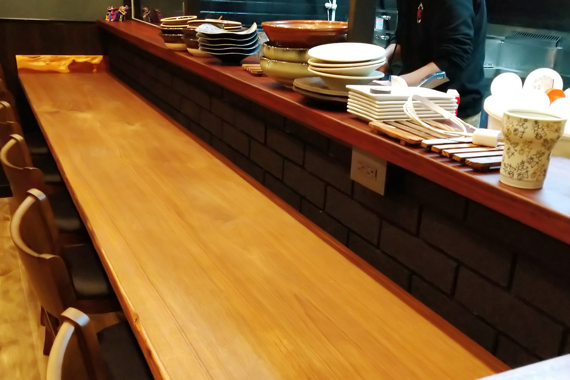 岡山市の飲食店さんの個室テーブルとカウンターを納品、施行させて頂きました。カウンターはビルマチーク、テーブルはケヤキです。 大切に使って頂いています。